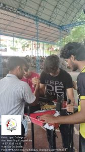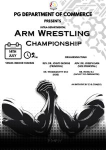 The PG Department of Commerce organised an Intra-Departmental Arm Wrestling Championship on 14th July 2025 at the college Indoor Stadium. The programme was conducted with the aim of promoting physical fitness, sportsmanship, and friendly competition among students. The event was an initiative by the students of S3 B.Com (B3) and coordinated by the faculty team. The event commenced at 2:00 PM with a brief inaugural session. Rev. Dr. Joshy George (Principal) inaugurated the programme and delivered the inaugural address, highlighting the importance of extracurricular activities in student development. Dr. Thomaskutty M.O (Head of the Department) addressed the gathering and encouraged students to actively participate in departmental events.The programme was coordinated under the guidance of Mr. Vishnu E.S (Faculty Coordinator).