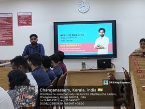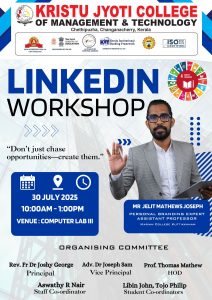 The Post Graduate Department of Management Studies conducted a LinkedIn Workshop on 30 July 2025 with 50 participants, coordinated by Ms. Aswathy R. Nair. The session, led by Mr. Jelit Mathews Joseph, Personal Branding Expert from Marian College Kuttikkanam, focused on LinkedIn profile creation, optimization, networking strategies, and job search tools. Through interactive discussions and practical guidance, students enhanced their professional online presence, with over 90% creating or improving their profiles. The programme concluded with a Q&A session and received highly positive feedback for its practical relevance, significantly improving students’ awareness of digital networking and personal branding.