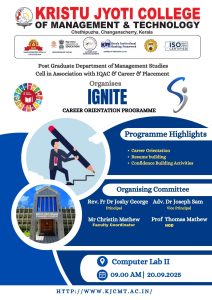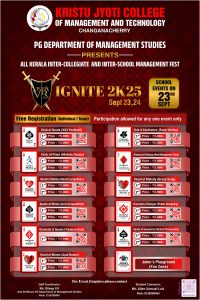 The PG Department of Management, Kristu Jyoti College of Management and Technology, organized the Inter-School Management Fest “IGNITE 2025” on 23 September 2025, with an impressive participation of 402 students from 18 schools across Kerala, coordinated by Mr. Dileep P. V. The event commenced with a formal inaugural ceremony featuring a prayer, welcome address, and presidential address by Rev. Fr. Dr. Joshy George CMI, followed by the official inauguration by Chief Guest Rev. Fr. Dr. Thomas Kallukalam CMI, who inspired students to channel their potential towards professional excellence and social responsibility. The programme also included engaging cultural performances, adding vibrancy to the event. IGNITE 2025 served as a dynamic platform for students to develop key managerial and interpersonal skills through a variety of competitive events that fostered strategic thinking, problem-solving, teamwork, communication, creativity, and digital proficiency. The fest received highly positive feedback, particularly for its large-scale participation and energetic atmosphere, successfully promoting holistic development, competitive spirit, and leadership among participants.