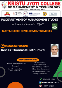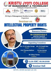 The Post Graduate Department of Management Studies, in association with IQAC, Kristu Jyoti College of Management and Technology, organized a Seminar on Intellectual Property Rights on 5 August 2025, with 73 participants attending the offline session coordinated by Mr. Dileep Viswan. The programme was inaugurated by the Principal, Rev. Fr. Dr. Joshy George, and included a felicitation by Adv. Dr. Joseph Sam, Vice Principal. The keynote session was delivered by Mr. Krishnaraj S, Master Trainer at ICT Academy of Kerala, who provided valuable insights into patents, copyrights, trademarks, and the role of IPR in protecting innovations and fostering entrepreneurship. The session was interactive and enriched with real-life examples, making complex legal concepts easy to understand. Feedback from participants was highly positive, with students appreciating the clarity, relevance, and practical orientation of the seminar. Overall, the programme enhanced students’ awareness of intellectual property rights, encouraged them to safeguard their ideas, and strengthened their understanding of innovation, legal ownership, and ethical practices in the knowledge economy.