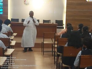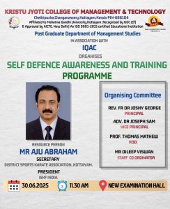 The Post Graduate Department of Management Studies organized a Self-Defence Awareness and Training Programme on 30 June 2025 under the Life Skills Development Framework, with 99 students participating in the offline session. Coordinated by Mr. Dileep Viswan, the programme featured Mr. Aju Abraham, Secretary of the District Karate Association, Kottayam and President of ISKF India, as the resource person. The event began with an inaugural session led by the Principal, Rev. Fr. Dr. Joshy George, followed by a felicitation by the Vice Principal, Adv. Dr. Joseph Sam. The training focused on situational awareness, risk perception, and practical self-defence techniques, supported by demonstrations and hands-on practice. An interactive Q&A session further enhanced student engagement. Feedback was highly positive, with participants appreciating the practical approach and relevance of the session. Overall, the programme effectively improved students’ confidence, personal safety awareness, and decision-making skills, contributing to their holistic development.
