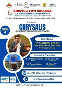 The Post Graduate Department of Management Studies, Kristu Jyoti College of Management and Technology, organized CHRYSALIS 2K25 – Management Association Inauguration on 23 July 2025, with 129 participants, coordinated by Mr. Dileep P. V. The event featured an inaugural address by Rev. Dr. Joshy Cheeramkuzhy CMI, Principal, and was formally inaugurated by Mr. Manesh Milan, CEO of Milan Solar, who delivered an insightful session on entrepreneurship titled “Roots, Risks and Revenue.” The programme included an oath-taking ceremony, felicitation, and cultural performance. Participants found the session highly inspiring, and the event effectively enhanced students’ understanding of entrepreneurship, leadership, teamwork, and sustainable business practices.