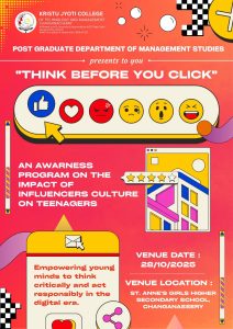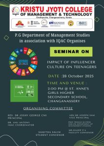 The Post Graduate Department of Management Studies, Kristu Jyoti College of Management and Technology, organized an Extension Activity – Seminar on “Impact of Influencer Culture on Teenagers” on 28 October 2025, with 60 participants, coordinated by Mr. Dileep P. V. The programme was conducted by MA HRM Semester I students for Classes VIII and IX students of St. Anne’s G.H.S., Changanacherry, aiming to create awareness about the influence of social media on thoughts, behavior, and lifestyle. The session featured interactive discussions, relatable examples, and engaging activities that helped students understand both the positive and negative aspects of influencer culture and encouraged responsible digital usage. Feedback from both students and faculty was highly positive, appreciating the relevance, clarity, and interactive approach of the session. Overall, the programme enhanced participants’ awareness of social media influence, promoted critical thinking and responsible online behavior, while also strengthening communication skills of the presenters and fostering community engagement.