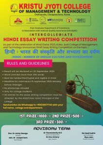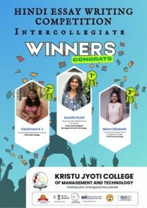 As part of the Hindi Diwas/Day Observance 2025 , Kristu Jyoti College of Management and Technology, Hindi Essay writing competition were announced on the topic हिन्दी : भारत की संस्कृति और सभ्यता का दर्पण (Hindi : Mirror of Indian culture and civilization). It was an Intercollegiate online competition. It is an informative and helpful writing session. It was such a good experience. This competition is so helpful. To help students to build confidence as they learn creative thinking skills.