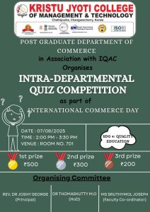 Post Graduate Department of Commerce, Kristu Jyoti College of Management and Technology, Changanacherry organized an Intra-departmental quiz competition as part of International Commerce day on 07/08/25 at 2.00 pm to 3.30 pm at Room number 701. The quiz was coordinated by Ms. Sruthymol Joseph, Assistant Professor, Post Graduate Department of Commerce. It was an individual competition and 2 students from each class were permitted to participate in the competition. Total 24 students from Commerce department were participated. The intra-departmental quiz competition held on International Commerce Day was a highly engaging and intellectually stimulating event.