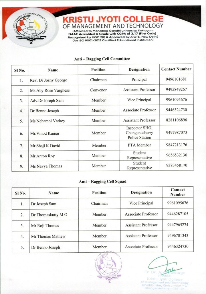 Anti-Ragging Cell plays a crucial role in an Educational Institution's framework. As per the guidelines of UGC under the Act of 1956, which is reformulated as UGC regulations on curbing the nauseating practice of Ragging in higher Educational Institutions, 2009, the establishment of Anti-Ragging Cell is an imperative in educational institutions. Kristu Jyoti College of Management and Technology (KCMT) keeps intact a healthy, cooperative and collaborative academic environment for the students. The institution accords protection to the new entrants from the anti-social act of ragging and has put in place an Anti- Ragging Cell with the following vision, mission and objectives.