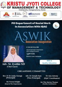The Postgraduate Department of Social Work, Kristu Jyoti College of Management and Technology conducted the Social Work Association Inauguration on 7th August 2025 at the Conference Hall of the college. The programme began with a prayer song by the department choir, followed by a welcome address by Ellena Susan, student MSW SEM 1. The Presidential Address was delivered by the Principal, Rev. Fr. Joshy Cheramkuzhy, CMI, who highlighted the significance of social work education and service to society. The association was formally inaugurated through the lighting of the lamp, symbolizing the beginning of a new academic and professional journey. The oath-taking ceremony of the newly elected office bearers was administered by Adv. Dr. Joseph Sam, marking the formal assumption of responsibilities by the student representatives.