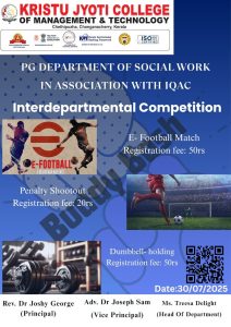 The Social Work Association of the Postgraduate Department of Social Work, Kristu Jyoti College of Management and Technology conducted an Interdepartmental Programme titled “Buddy Bash” on 30 July 2025 for students across various departments of the college. The programme was organized as an association-led initiative, with the aim of promoting interdepartmental interaction, peer bonding, and co-curricular engagement among students. As per the discussions held in the association and departmental meetings, the venue and activities were finalized. The programme was coordinated under the guidance of faculty coordinator Ms. Treesa Delight.