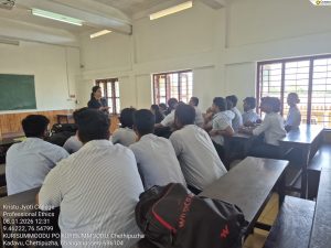 The Commerce department of our college organized a Professional Ethics Session on 08/01/2026 (2:40pm - 3:30pm) for the students of B.Com Computer Application Batch 02 Semester 06. The session aimed at the objective of creating awareness about ethical values and professional conduct required in today’s competitive corporate and technological environment. The workshop was led by Ms. Sandra Babu Assistant Professor with extensive experience. The session helped the students to acquire informative knowledge about ethical values. The session focused on the concept and importance of professional ethics in business and computer application fields.