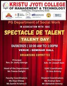 The Post Graduate Department of Social Work, in association with the Internal Quality Assurance Cell (IQAC) of Kristu Jyoti College of Management and Technology, Changanacherry, organized Talent Day 2025 – “Spectacle de Talent” on 4th August 2025 at the Seminar Hall to provide a platform for students to showcase their creativity and promote holistic development. The programme began with a prayer song, followed by a welcome address by Ms. Santhi Krishna S, and an inaugural address by Rev. Dr. Joshy George, Principal, who emphasized the importance of creativity and self-expression. Felicitations were delivered by Adv. Dr. Joseph Sam, Vice Principal, and Ms. Treesa Delight, Head of the Department, and the session concluded with a vote of thanks by Mr. Dan Joseph Abraham. The cultural segment featured diverse performances by BSW and MSW students, including semi-classical and western dance, group songs, instrumental solos, kavitha recitation, nadanpattu, and group dances, reflecting their artistic talent and enthusiasm. The event created a lively and engaging atmosphere, encouraging participation and appreciation, and ultimately served as a meaningful platform for students to build confidence, express their abilities, and strengthen camaraderie.