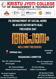 The Post Graduate Department of Social Work, in association with the Internal Quality Assurance Cell (IQAC) of Kristu Jyoti College of Management and Technology, Changanacherry, organized Freshers’ Day 2025 on 4th August 2025 at 1:30 PM in the Seminar Hall to warmly welcome newly admitted BSW and MSW Semester 1 students and foster an inclusive academic environment. The programme was conducted under the leadership of Rev. Dr. Joshy George, Principal, and Adv. Dr. Joseph Sam, Vice Principal, with guidance from Ms. Treesa Delight, Head of the Department, and Dr. Anu Antony, IQAC Coordinator, and was coordinated by Ms. Subi K Varghese and Ms. Riya Tomy with active support from faculty members and student coordinators. Designed to help students feel comfortable and connected, the event featured interactive sessions and cultural activities led by senior students, promoting peer bonding and familiarizing freshers with the department’s values and expectations. The programme was held in a lively and welcoming atmosphere, marking a positive and memorable beginning to their academic journey.
