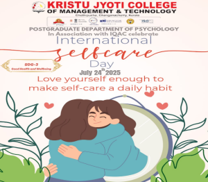 The Post Graduate Department of Psychology, in collaboration with the IQAC at Kristu Jyoti College of Management and Technology, organized an event on July 24, 2024, to observe International Self-care Day. This initiative aimed to highlight the importance of self-care as a key element of health and well-being. The date, July 24th, serves as a reminder that self-care can be practiced around the clock, emphasizing its significance year-round. On this occasion, third-year students (2022-2025) led an awareness session for all students of Kristu Jyoti College, promoting the value of self-care.