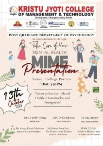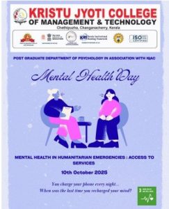 The PG Department of Psychology, Kristu Jyoti College of Management and Technology, in association with IQAC, observed World Mental Health Day 2025 on 10th and 13th October, based on the theme “Access to Services – Mental Health in Catastrophes and Emergencies.” The observance included ribbon distribution, Rolls of Hope, poster exhibitions, model presentations, and interactive games to promote mental health awareness.