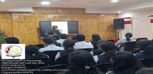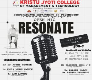 The PG Department of Psychology observed International Self-Care Day 2025 in association with IQAC through awareness activities promoting self-care among the college community. As 24th July was a holiday, a digital poster highlighting the importance of self-care was shared in official college groups. The on-campus observance was held on July 25, 2025, coordinated by Ms Anakha Baiju and Ms Esther Varghese, with documentation by Mr Noel Varghese. A Self-Care Card Sharing Activity by II-year BSc Psychology students distributed motivational cards across campus to students and staff, followed by an awareness announcement by Ms Steffy Thomas. The highlight was “RESONATE, an open mic event where students from various departments expressed thoughts on self-care through poems, songs, and reflections, promoting mental and emotional well-being. The overall outcome of the programme was highly encouraging. It fostered awareness, empathy, and emotional expression among students and staff.