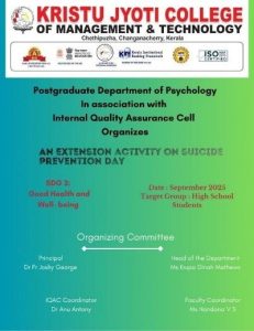 The Postgraduate Department of Psychology, in association with the IQAC of Kristu Jyoti College of Management and Technology, organized an awareness class in September 2025 as part of World Suicide Prevention Day. The sessions were conducted by first-year M.Sc. Psychology students for high school students from various schools, focusing on mental health awareness, causes and warning signs of suicidal thoughts, and effective intervention strategies.
