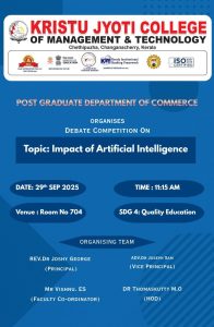 The Postgraduate Department of Commerce organized a Debate Competition on 29 September 2025, coordinated by Mr. Vishnu E. S., with the active participation of 11 students. The event witnessed enthusiastic engagement as participants presented well-researched arguments both in favor of and against the impact of Artificial Intelligence, covering key aspects such as productivity, ethical concerns, employment implications, and its transformative influence on education and business. The session was marked by healthy competition, critical analysis, and evidence-based reasoning, with participants evaluated on content, delivery, clarity, and rebuttal skills. The programme received highly positive feedback for its relevance, organization, and the platform it provided for expressing diverse perspectives on a contemporary issue. Overall, the competition enhanced students’ understanding of Artificial Intelligence, strengthened their critical thinking, communication, and presentation skills, encouraged research and analytical abilities, fostered teamwork and collaboration, built confidence, and contributed to the promotion of quality education in alignment with Sustainable Development Goal 4