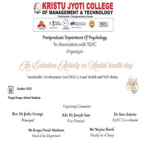 The Department of Psychology of Kristu Jyoti College of Management and Technology, Changanassery organized “Empowering Communities through Service Learning: Building Capacity for Professional Development”, a skill development program for the students on 10th October 2022 in association with IQAC. On 10th, 12th, 13th and 14th of October 2022, the first and second year post graduate students of the department of psychology conducted a session on Mental Health Awareness in different schools including the Adithya Vilasam School, Thazhava, Karunagapally, MGM High school, Pampady NSS GHS & NSS BHS, Karukachal, St. Joseph’s GHSS, and St. Berchman’s HSS, Changanassery. Students from 8th, 9th, 10th and 11th grades participated in the programme. The outcome of the class was to create awareness on mental health, why mental health is important to us, the problems faced by students in this day and age, and various tips to take care of our mental health. By taking care of our mental health, we can grow into a healthy individual in both mind and soul.