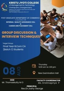 The Group Discussion & Interview Techniques Programme is designed to prepare final year BCom students for the challenges of group discussions and personal interviews, which are critical components of the recruitment process. This initiative aims to enhance students’ communication skills, critical thinking abilities, and confidence to excel in group settings and one-on-one interviews. The Programme Include :