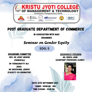 The Post Graduate Department of Commerce at Kristu Jyoti College of Management and Technology hosted a "Seminar on Gender Equity" on September 16, 2025, at 11.30 AM to 12.30 PM in Room No. 806. The program's core theme was "Empower Equity," aiming to deepen understanding of gender equity, distinguishing it from mere equality. Ms. Deepa John served as the Resource Person, guiding the session and providing insights on the topic. The initiative was designed to raise awareness and foster discussions on gender equity, reflecting Kristu Jyoti College's commitment to both academic and social development. The program likely explored the nuanced differences between equality and equity, promoting the idea of providing tailored support to achieve fair outcomes for all.