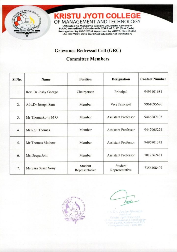 The Grievance Redressal Cell and Internal Complaints Committee organized a seminar at Kristu Jyoti College's Seminar Hall on December 11, 2023, with a significant student turnout. The seminar focused on educating students about the college's grievance redressal mechanisms and providing legal insights into filing grievances. Renowned legal expert Adv. Sumesh Andrews served as the resource person, offering valuable information on students' rights, due process, and the legal framework governing grievance redressal in educational institutions. An interactive session allowed students to seek clarifications, and case studies illustrated practical applications. The seminar also outlined plans for future awareness campaigns and outreach programs. The event concluded with a feedback session, encouraging participants to share their thoughts. The large attendance and engagement indicated a keen interest among students in understanding and navigating the grievance redressal process. The Grievance Redressal Cell and Internal Complaints Committee affirmed their commitment to maintaining a safe and inclusive campus environment