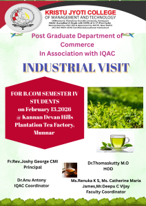 The Post Graduate Department of Commerce, Kristu Jyoti College of Management and Technology, Changanacherry, organized a One-Day Industrial Visit for B. Com Second Year students on 13th February 2026 to the Kannan Devan Hills Plantations Company Tea Factory, Munnar.