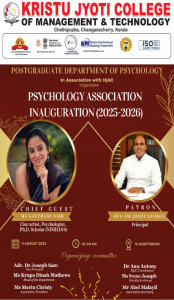 The Postgraduate Department of Psychology, Kristu Jyoti College of Management and Technology, Changanacherry, in association with IQAC, organized the Psychology Association Inauguration for the academic year 2025–2026 on 11th August 2025 at 10:00 AM in the KJ Auditorium, marking the formal commencement of departmental activities to foster leadership, creativity, and academic engagement. The event was graced by the Chief Guest, Ms Gauthami Nair, Cine Artist, Psychologist, and PhD. Scholar at NIMHANS, with Rev Dr Joshy George, Principal, as the Patron. The programme began with Ranga Pooja, followed by a welcome address by Ms Krupa Dinah Mathews, Head of the Department of Psychology, and the Presidential Address by Rev. Dr Joshy George, who highlighted the role of association activities in building professional and interpersonal skills. The inauguration was marked by the Lighting of the Lamp, symbolising enlightenment and a new academic journey. The highlight was an inspiring guest session by Ms Gauthami Nair on integrating creativity and psychological understanding in life and career, motivating students toward authenticity, self-awareness, and holistic well-being. The event concluded with vibrant cultural performances by UG and PG students.