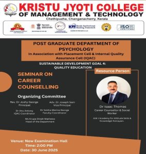 The Postgraduate Department of Psychology, in association with the Placement Cell and IQAC of Kristu Jyoti College of Management and Technology, successfully organized a Seminar on Career Counselling on 30th June 2025. Dr. Isaac Thomas led the seminar session, sharing his vast experience in career counseling and offering practical advice on self-assessment, goal setting, and exploring global career opportunities. His interactive approach engaged the audience effectively, sparking enthusiasm and reflection among the participants.
